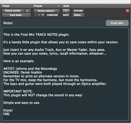 Final Mix SoftwareTrack Notes IIIThis is the Final Mix TRACK NOTES plugin. It's a handy little plugin that allows you to save notes within your session. Just insert ...