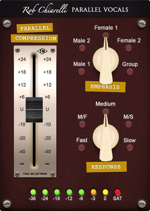 Final Mix SoftwareTHE PARALLEL VOCALS COMPRESSORThe vocal sound you've been dreaming about is finally available in a simple and easy to use plugin. No phase shift, n...